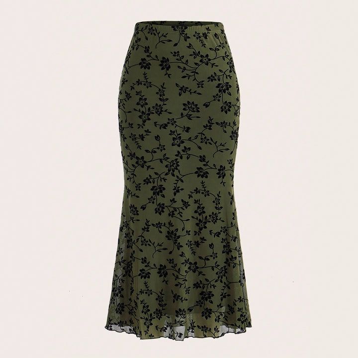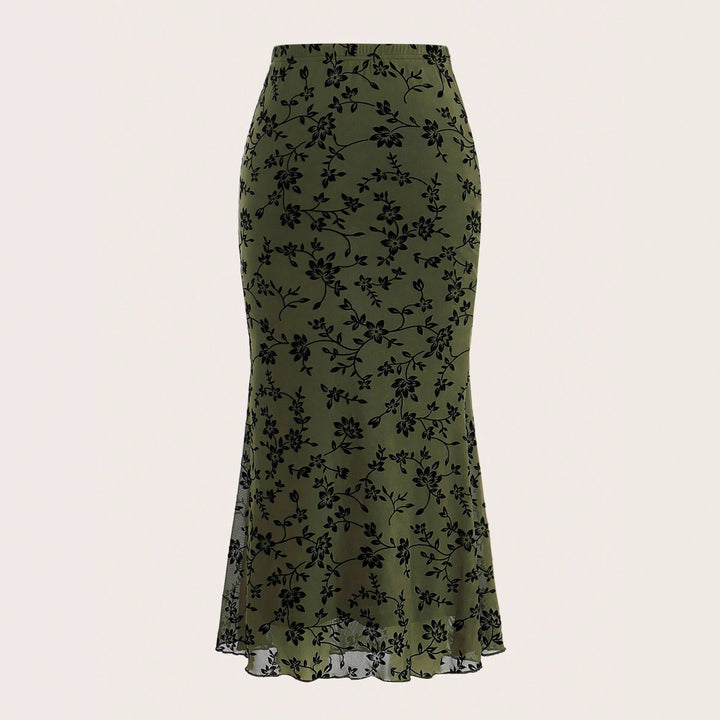 Dark Green Floral Half-length Fishtail Skirt For Women
