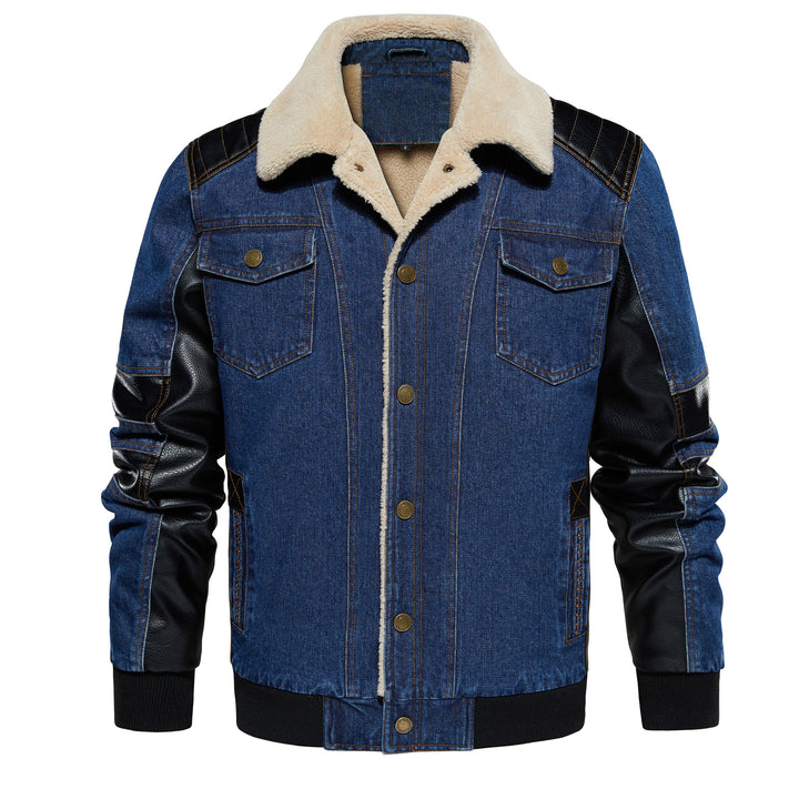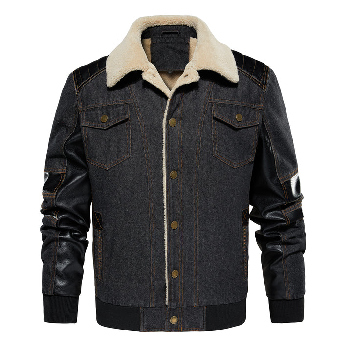Men's Thickened Work Jacket, Denim - Patchwork Collared Multi - Pocket Autumn & Winter Jacket