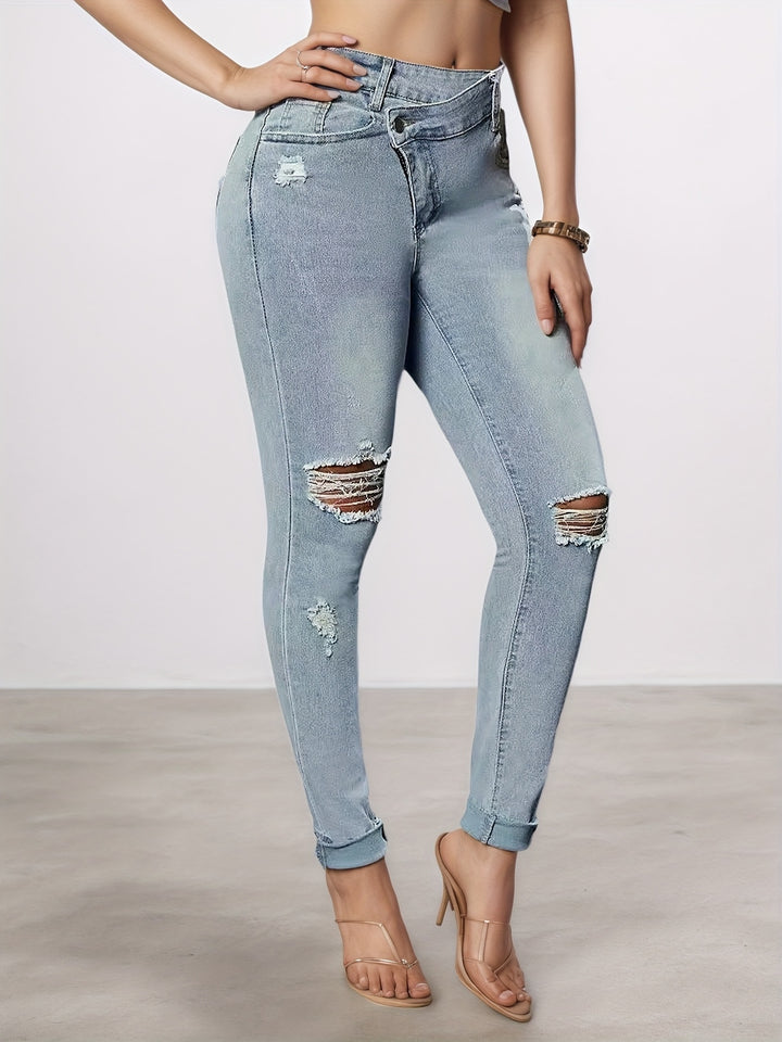 Tear Washed Denim Jeans, Women's Slim Fit Small Foot Design Slim Fit Denim Leggings, Equipped With A Beautiful Waist Belt